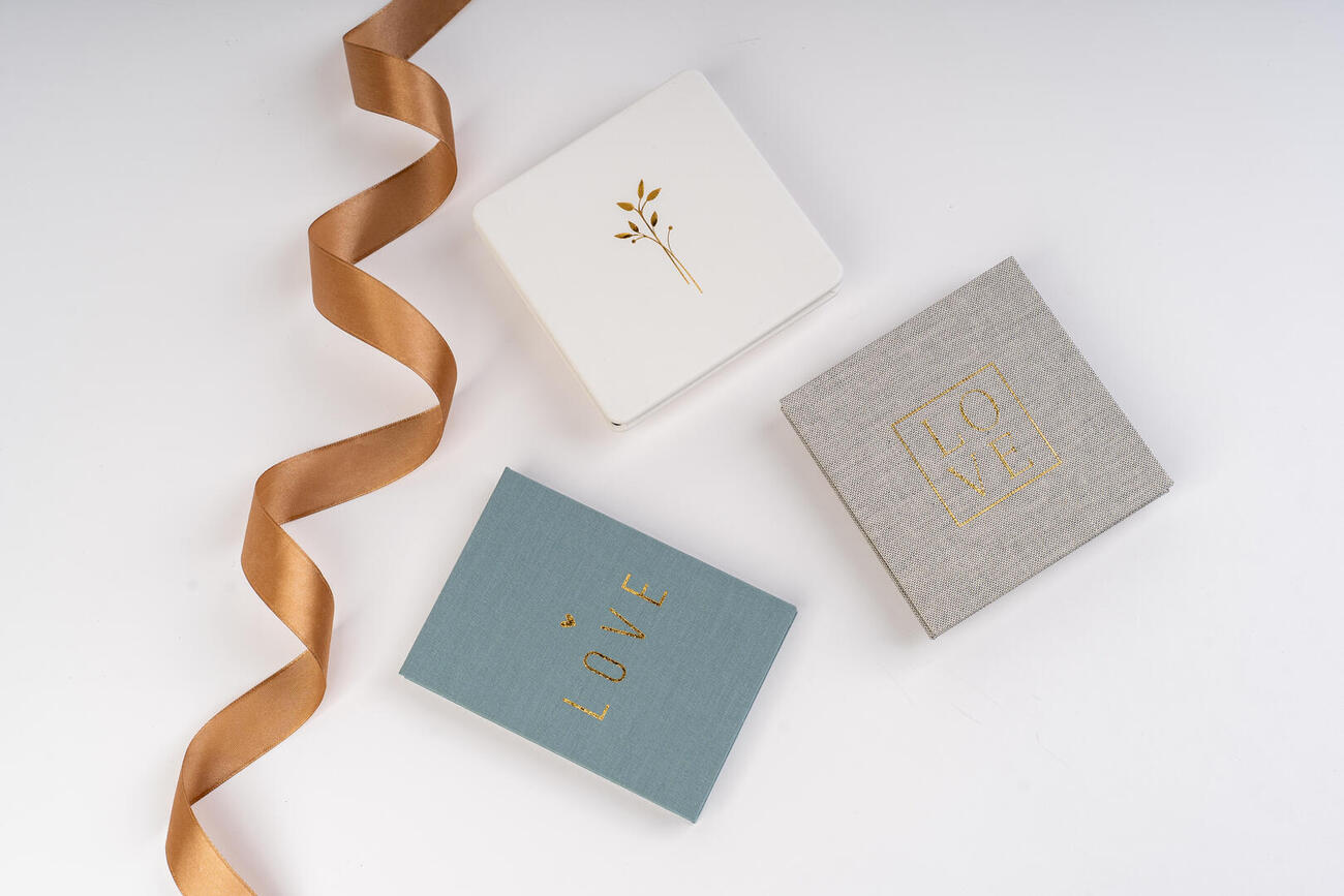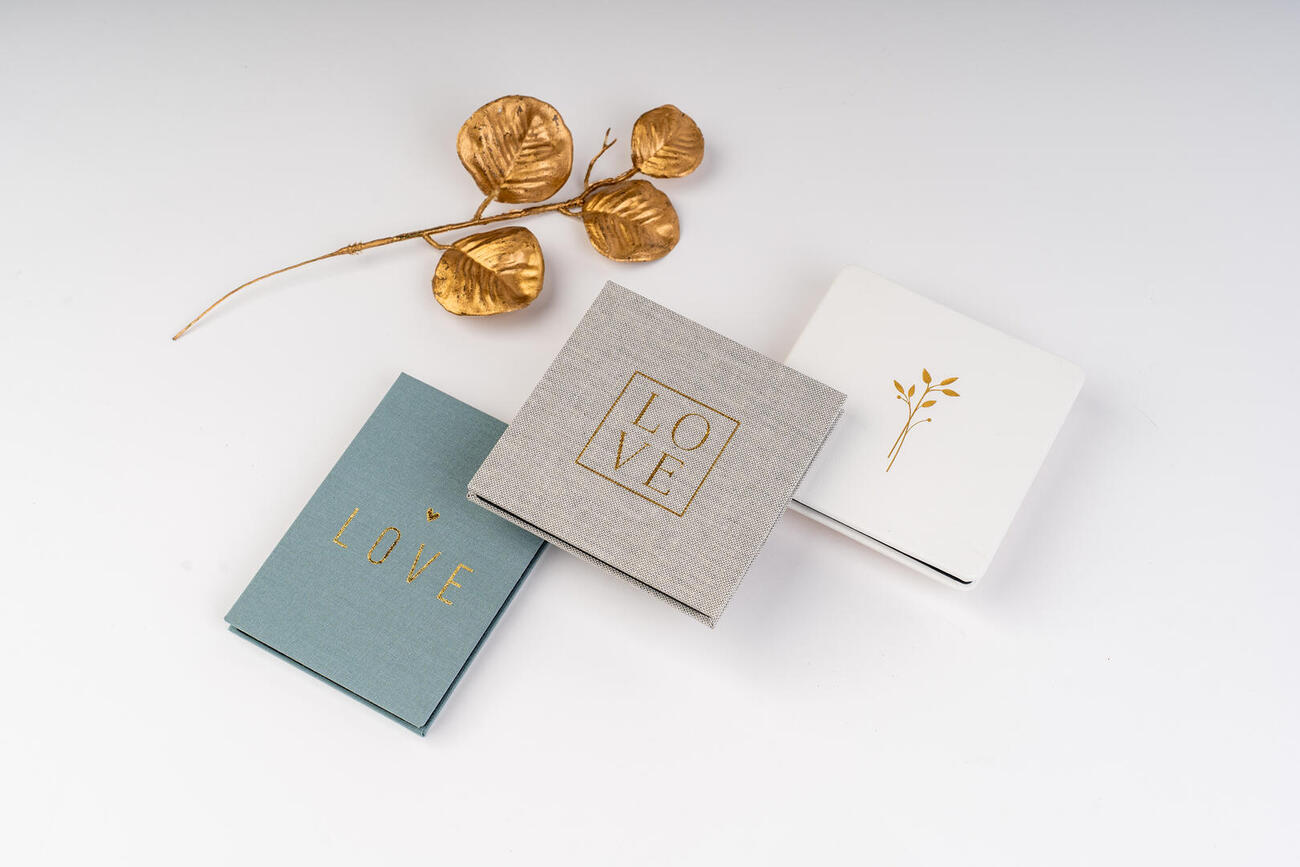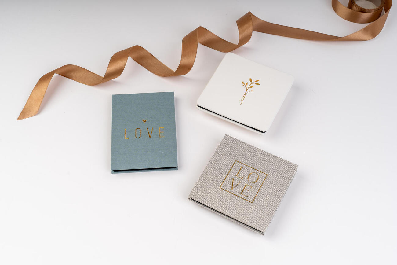 Für das Hardcover stehen 10 speziell ausgewählte Samt- und Veloursstoffe zur Verfügung. Ein Magnetverschluss erzeugt beim Öffnen und Schließen des Leporellos einen besonderen Effekt und schützt es zugleich. Zusätzlichen Schutz bietet eine dekorative Öko-Minibox, die in 2 Farben erhältlich ist. Sie macht das Mini-Leporello zum perfekten Geschenkartikel. Das Mini-Leporello (8x8 cm) ist auch als eine Art Set mit Box für USB-Stick erhältlich.