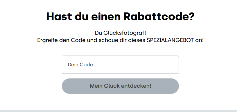 Die Aktionsprodukte findest du ab dem 18.11.2025 im Shop unter „Rabattaktionen“. Um das Angebot zu nutzen, gib den Rabattcode im Feld „Dein Code“ ein (bekommst du noch per Mail). Nach der Eingabe siehst du die Produkte, die an der Aktion teilnehmen. Du kannst eines der folgenden Sets zum Preis von 1 € bestellen: Triplex mit Passepartout-Fotoeinschub (20x25 cm) + Foto in Passepartout (mit Fotoeinschub, 20x25 cm). DUO mit Passepartout-Fotoeinschub (20x25 cm) + Foto in Passepartout (mit Fotoeinschub, 20x25 cm). Die Aktion gilt vom 18.11.2025 bis 01.12.2025 oder solange der Vorrat reicht. Der Rabattcode kann nur einmal verwendet werden. Das Angebot ist nicht mit anderen Aktionen für dieselben Produkte kombinierbar und gilt nur für Bestellungen aus dem Rabattaktionen-Menü. Kunden, die sich für die Aktion angemeldet haben, aber bis zum 1. Dezember 2025 keinen Gebrauch davon machen konnten oder aufgrund ausgeschöpfter Bestände leer ausgegangen sind, erhalten im Februar 2026 eine weitere Gelegenheit, das Angebot zu nutzen.
