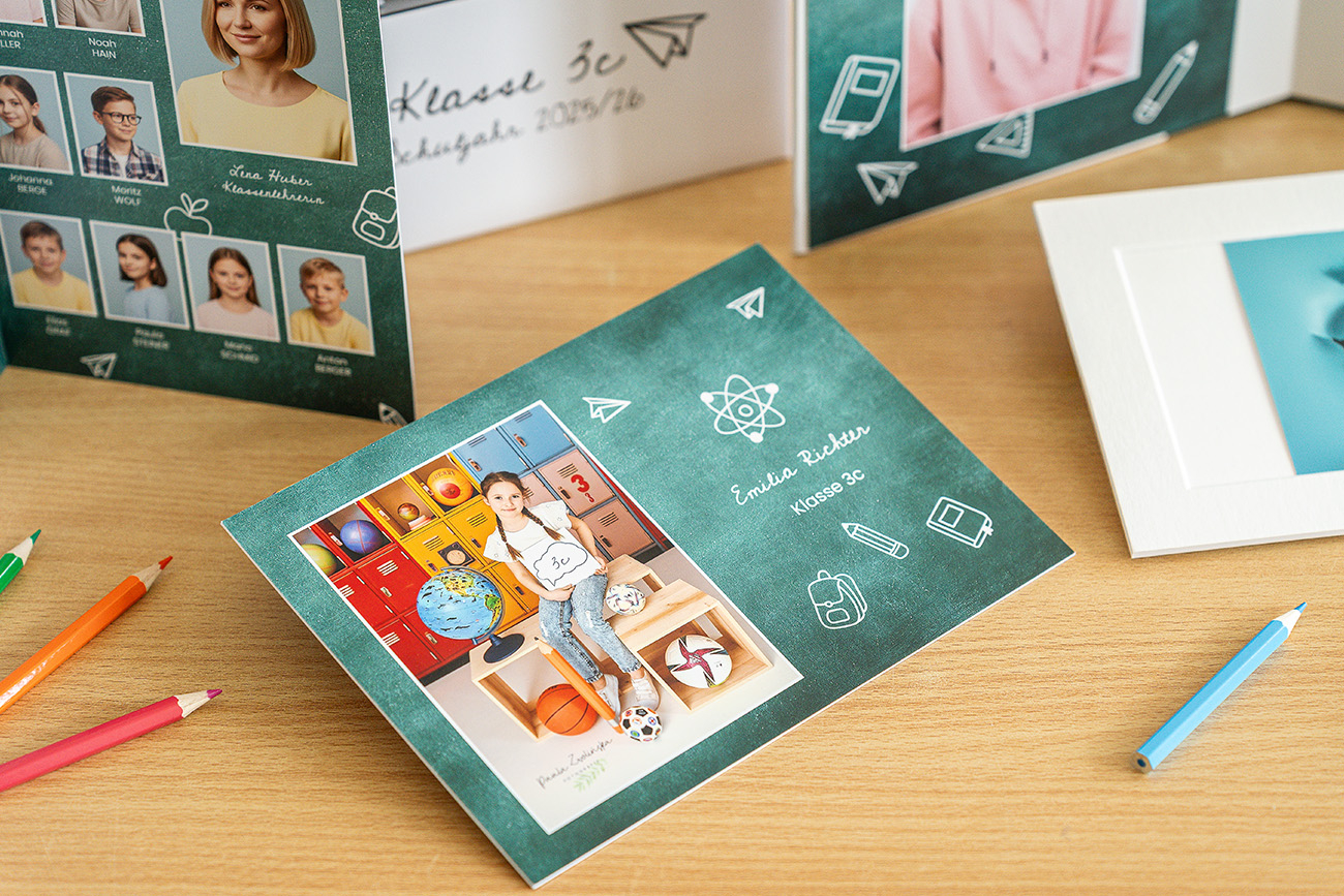 und liebevollen Elementen gestaltet ist. Dazu gehören unter anderem: Buntstifte, Buchstaben, eine Schultafel, Tiere usw. Schau selbst, wie du deine Fotoprodukte gestalten kannst.