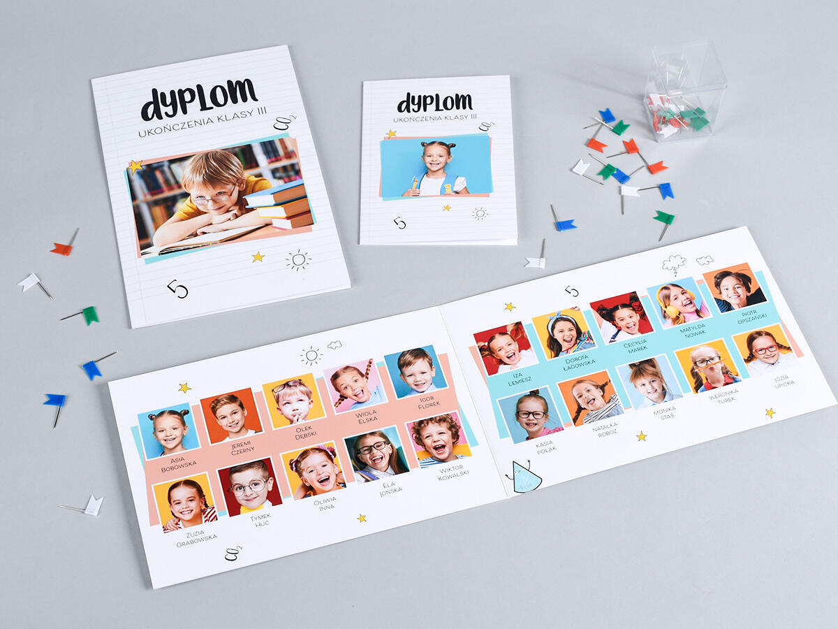 Jeśli właśnie takich propozycji szukasz dla swoich klientów, zaproponuj im DUO Lite, czyli nasz mini album na dwie strony. Ma format 20x20 cm i sztywne, solidne karty. Dla Duo Lite mamy w nShopie dostępnych wiele gotowych szablonów szkolnych, które wykorzystasz, by wygodnie zaprojektować pamiątkę ze zdjęciami. Szablony mają edytowalne pola, dzięki czemu każdy uczeń może na koniec roku otrzymać personalizowane tablo np. ze swoim imieniem lub „ksywką”. Samo projektowanie jest bardzo intuicyjne, a pomoże Ci w tym nasz darmowy nDeasigner (mówiąc prosto taki program do zrobienia tablo, w którym wygodnie układasz zdjęcia, dodajesz napisy, tytuł, imiona itd.) Ponieważ DUO Lite to dwie otwierane na płasko strony, możesz na obu zaprojektować zdjęcia uczniów albo na jednej stronie dodać zdjęcie wychowawcy, a na drugiej uczniów. Możesz też np. na jednej stronie umieścić zdjęcia, a na drugiej pamiątkowy cytat lub miejsce na podpisy od koleżanek, kolegów, pozostałych nauczycieli. Okładka może być zadrukowana, więc warto na niej umieścić grupowe zdjęcie klasowe.