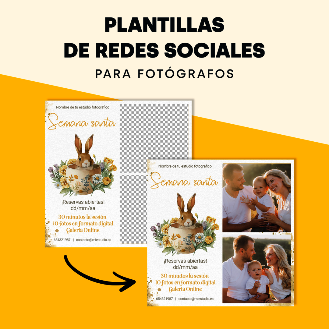 Plantillas editables para publicaciones y stories, creadas específicamente para fotógrafos que venden productos fotográficos. Solo tienes que añadir tus imágenes y ajustar el contenido para promocionar sesiones, álbumes y productos terminados de manera coherente.