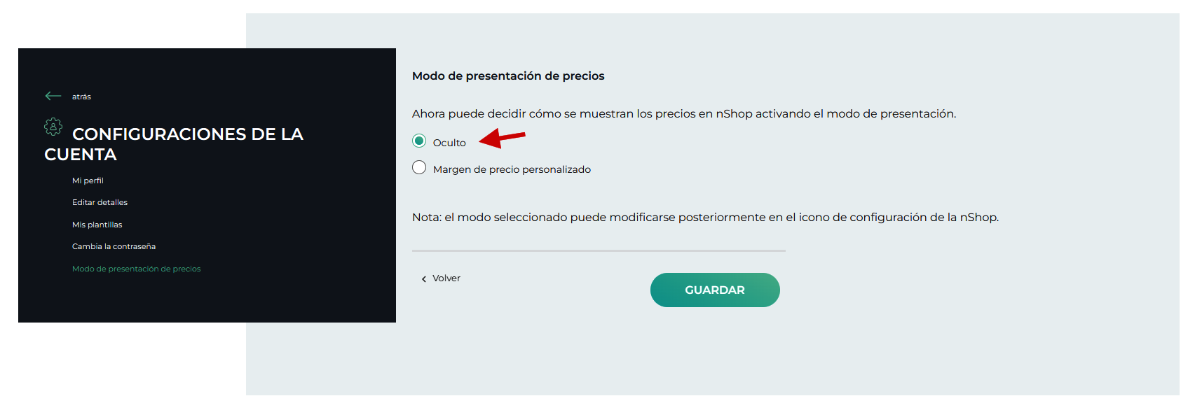 Ocultar completamente los precios - si eliges esta opción, no verás ningún precio en la tienda nShop (esto incluye cambios de precio para complementos, tallas, etc.)