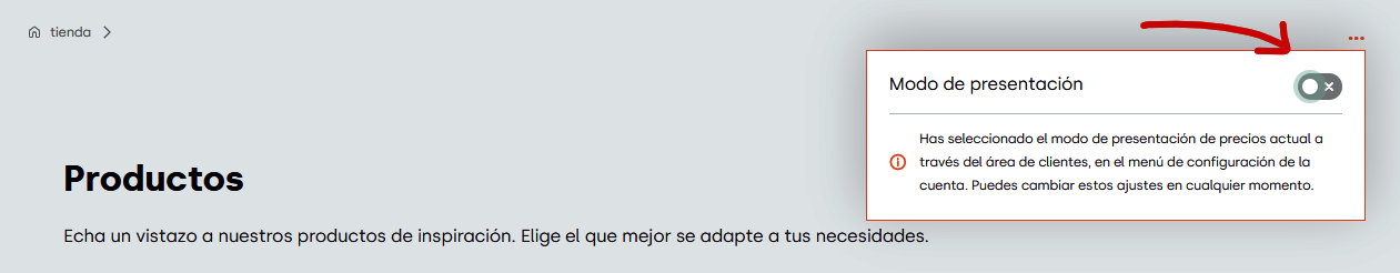 Una vez guardados estos ajustes, podrás utilizar en cualquier momento el modo de presentación, que reflejará la opción que hayas seleccionado en el paso anterior: sin precios o precios con margen añadido. No olvides guardar los cambios que realices cada vez. Puedes activar y desactivar el modo de presentación en cualquier momento, seleccionando el icono de configuración (3 puntos) de nShop.