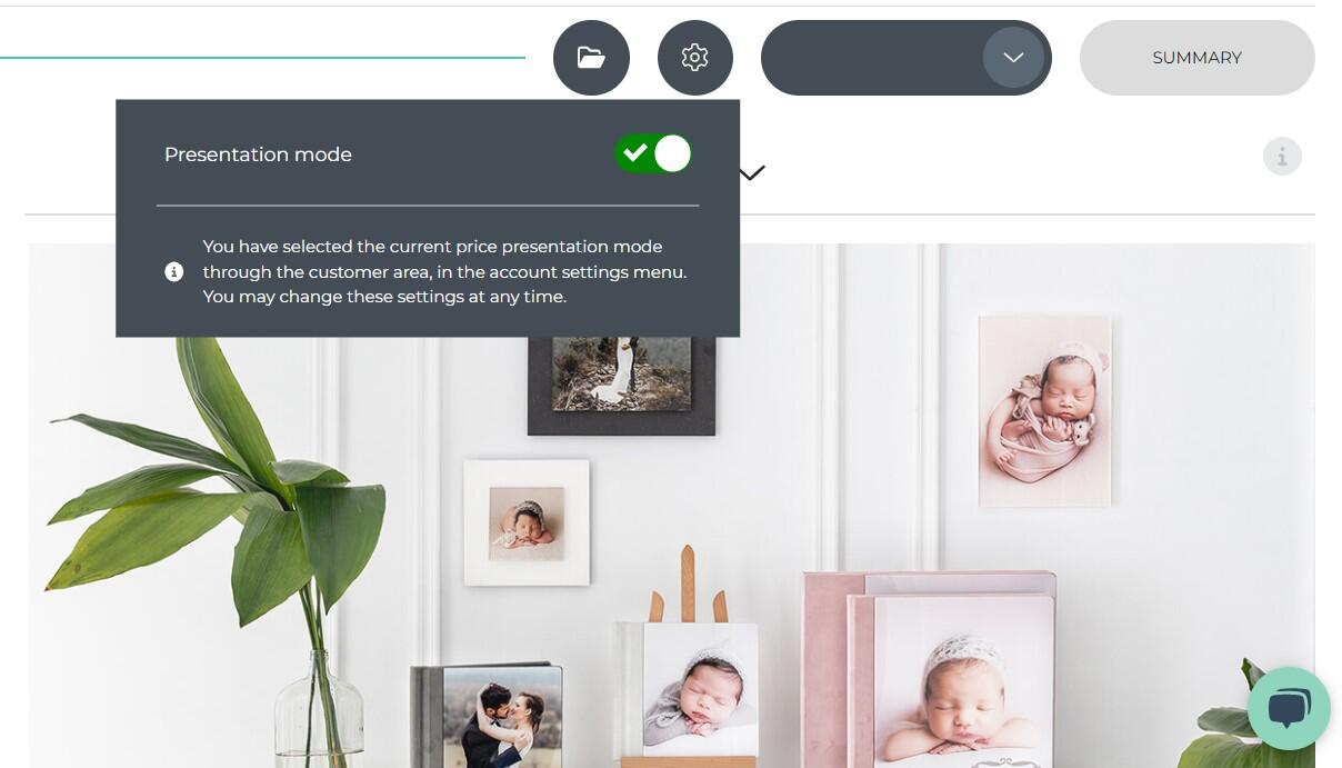 Une fois ces paramètres enregistrés, vous pourrez à tout moment utiliser le mode de présentation, qui reflétera l'option que vous avez sélectionnée à cette étape : pas de prix affiché ou des prix affiichés avec marge . N'oubliez pas de sauvegarder les modifications apportées à chaque fois. Vous pouvez activer et désactiver le mode de présentation à tout moment en sélectionnant l'icône des paramètres du nShop (icône pignon).
