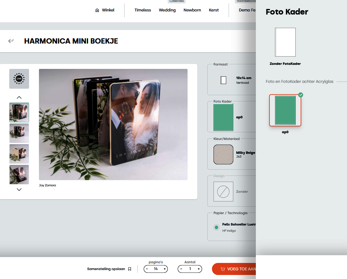 Om het ontwerpen en bestellen van deze nieuwe optie nog makkelijker te maken, hebben we de “FOTO-KADER”-vraag toegevoegd in onze Shop. Je hebt nu de keuze uit 'zonder foto kader' of 'AP0' (Acryl). Dit is opnieuw een stap richting een nog eenvoudigere en intuïtievere configuratie.