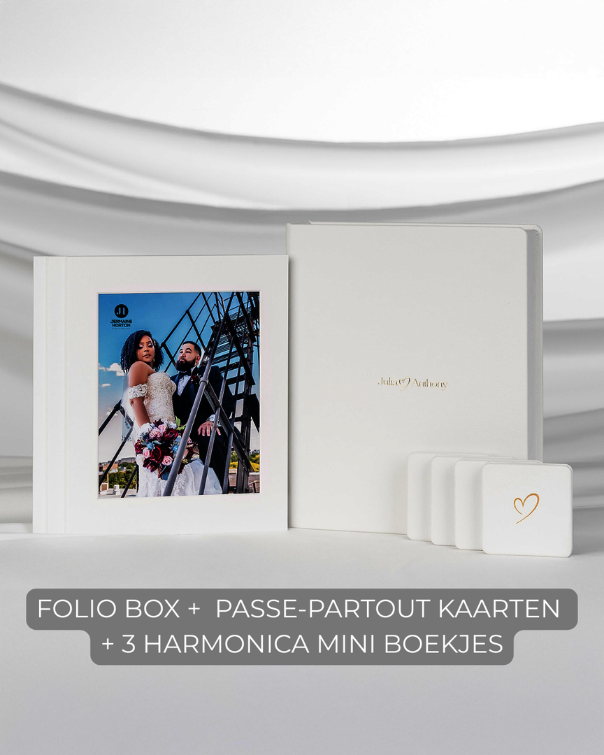 Harmonica mini Boekje | formaat: 8x8 cm, 10x14 cm materiaal/ kleur: J53 Black Orchid, J63 Milky Beige, J64 White Orchid personalisatie: UV Print of Gilding papier: Felix Schoeller Lustre |