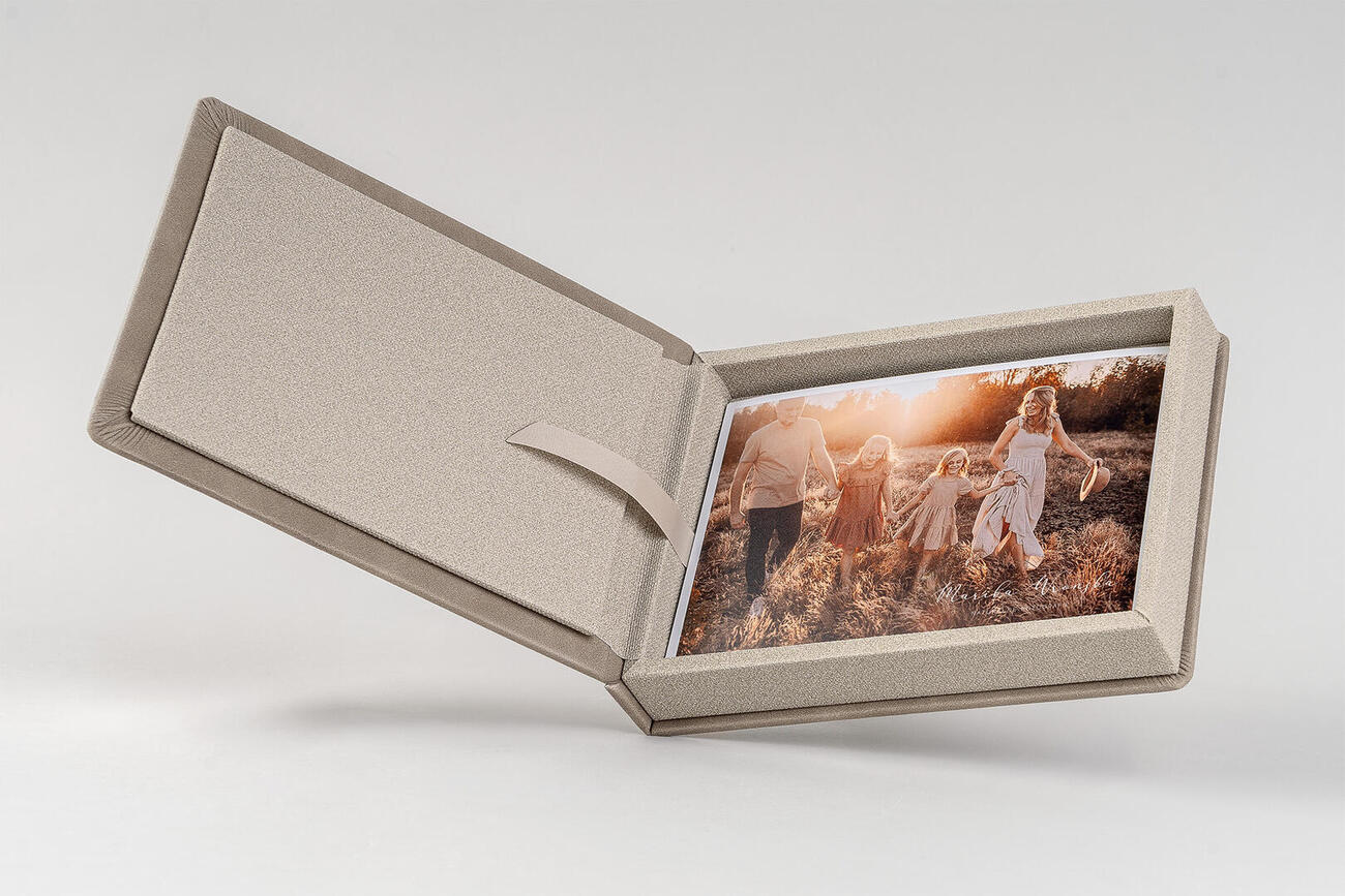 Opakowania w linii Classic tworzone są z tkanin introligatorskich, ekoskór, tkanin duo lub ich połączenia (dopasowanego kolorystycznie). Na zewnętrznej części opakowania w danej linii możesz wykonać spersonalizowany napis - metodą graweru, nadruku UV, stempla czy czcionki introligatorskiej. W opakowaniach Classic zmieszczą się zdjęcia wykonane w formatach: 10x15, 13x18,15x23, 20x25 i 20x30 cm. Fotografie umieszczone w opakowaniu możesz wzbogacić o nośnik pamięci USB, dzięki czemu oddajesz klientowi zlecenie w dwóch wersjach: papierowej i elektronicznej.