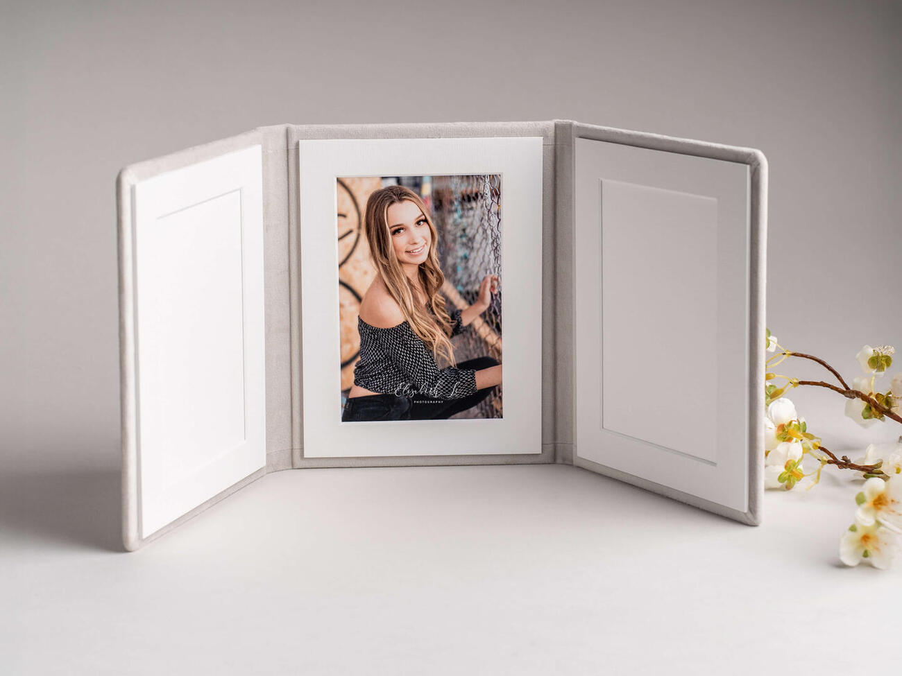 To elegancki produkt na trzy zdjęcia z możliwością ich łatwej wymiany. Występuje w jasnej, aksamitnej oprawie z możliwością personalizacji grawerem. Idealny do sesji ślubnych, dziecięcych, rodzinnych i wielu innych.